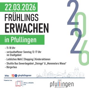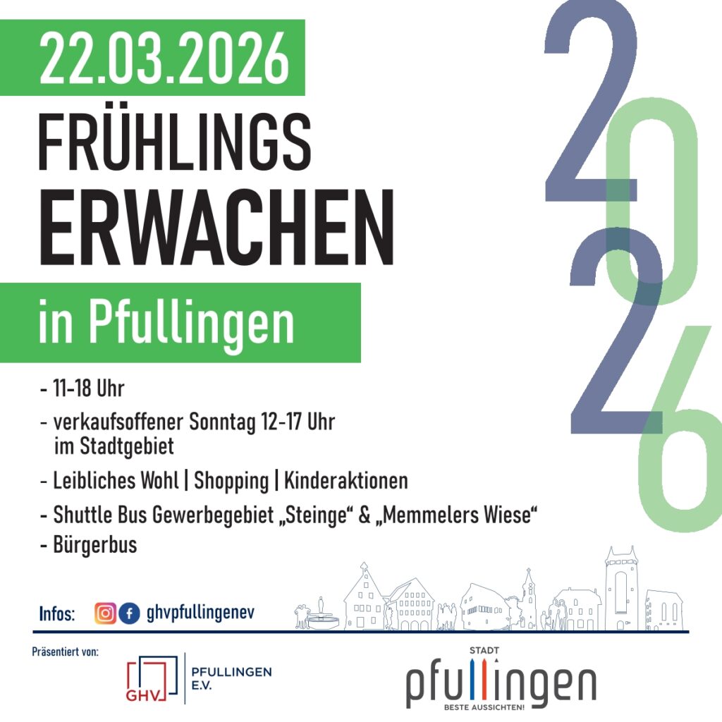 Auch in diesem Jahr findet wieder das etablierte Frühlingserwachen mit verkaufsoffenem Sonntag in Pfullingen statt. Der GHV, die Gewerbegebiete, zahlreiche Vereine und die Stadt laden Gäste aus Nah und fern ein, am Sonntag, 22. März, nach Pfullingen zu kommen. Das Frühlingserwachen findet von 11:00 bis 18:00 Uhr statt – der verkaufsoffene Sonntag ist von 12:00 bis 17:00 Uhr.